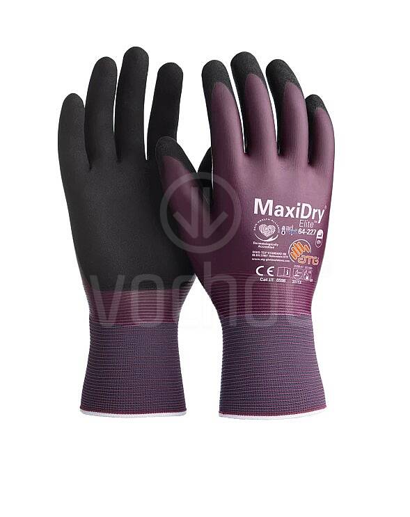 Celomáčené rukavice MaxiDry Elite s tloušťkou materiálu pouhých 0,7 mm, dlouhé 25 cm, jsou nejtenčí a nejlehčí montážní rukavice pro použití v prostředí s přítomností olejů, jaké v řadě ATG byly vyrobeny. Rukavice jsou 3/4 nánosové a mají náplet na zápěstí. Dělka rukavic je 25 cm. Rukavice jsou pro použití v v mastném nebo vlhkém prostředí.Protiskluzná povrchová úprava s využitím technologie „micro-cup“ umožňuje kontrolovaný a kvalitnější úchop ve vlhkém a olejnatém prostředí. Aby nebyla omezena flexibilita, používá se protiskluzná úprava pouze tam, kde je to opravdu potřeba – v oblasti dlaně. Technologie GRIPtech® snižuje únavu ruky a zvyšuje bezpečí.
