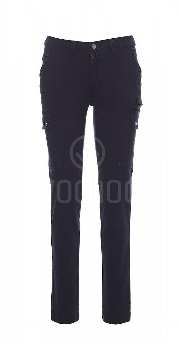 Dámské kalhoty klasického střihu, streč, celoroční, elastické pásky na bocích a poutka v pase, zapínání na zip a na kovový knoflík, dvě přední kapsy klasicého střihu, dvě postranní kapsy s klopou a druky, jedna kapsa na zip po levé straně, skrytá kapsa na svinovací metr po pravé straně, dvě zadní prostřižené kapsy s knoflíkovou dírkou a knoflíkem.