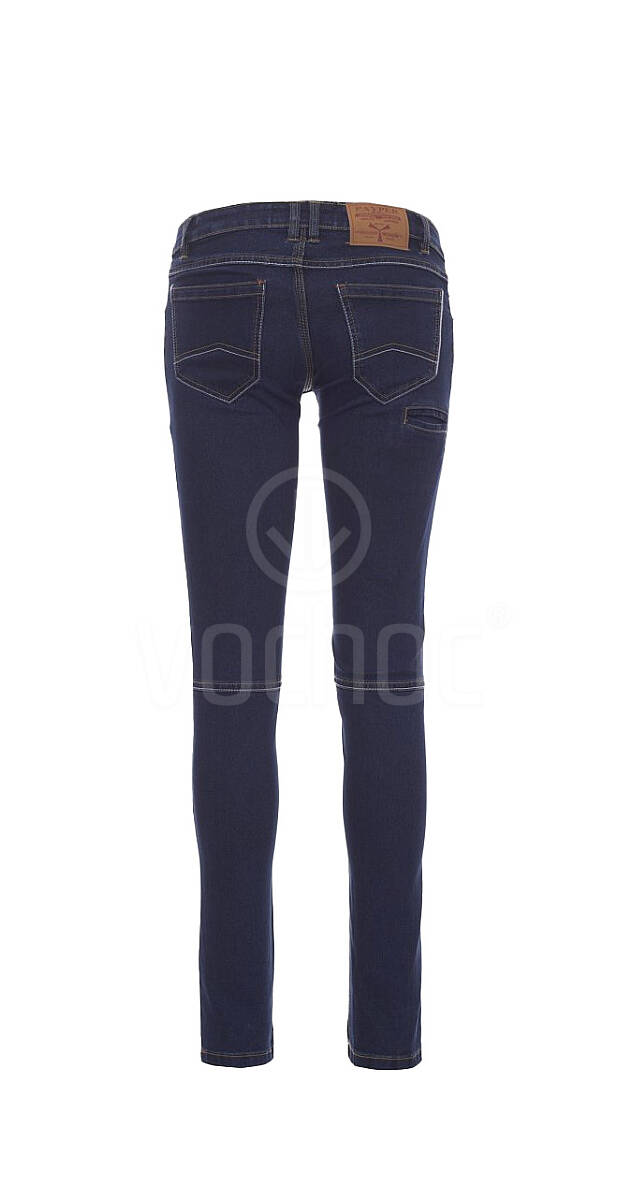 Dámské kalhoty džínového střihu. S pěti kapsami, zapínaní na kovový zip a knoflík, poutka v pase, 1 skrytá kapsa na svinovací metr, 1 kapsička na tužky a cutter, ošetření stone washed, efekt obnošení a oprání, úzké nohavice, kontrastní odolné trojjehlové prošití na vnitřní straně nohavice.