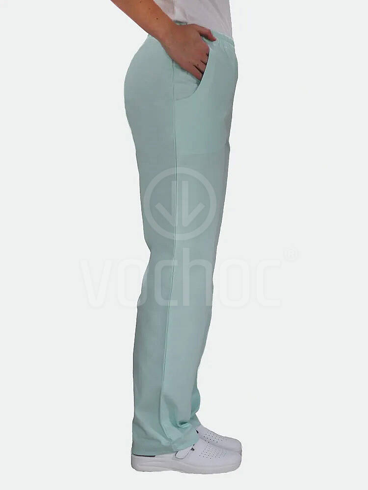 Dámské zelené lékařské kalhoty Dáša volného pohodlného střhu, které jsou vhodné i do potravinářství, zdravotnictví apod. Dvě přední klínové kapsy, po celém obvodu pasu na gumu.