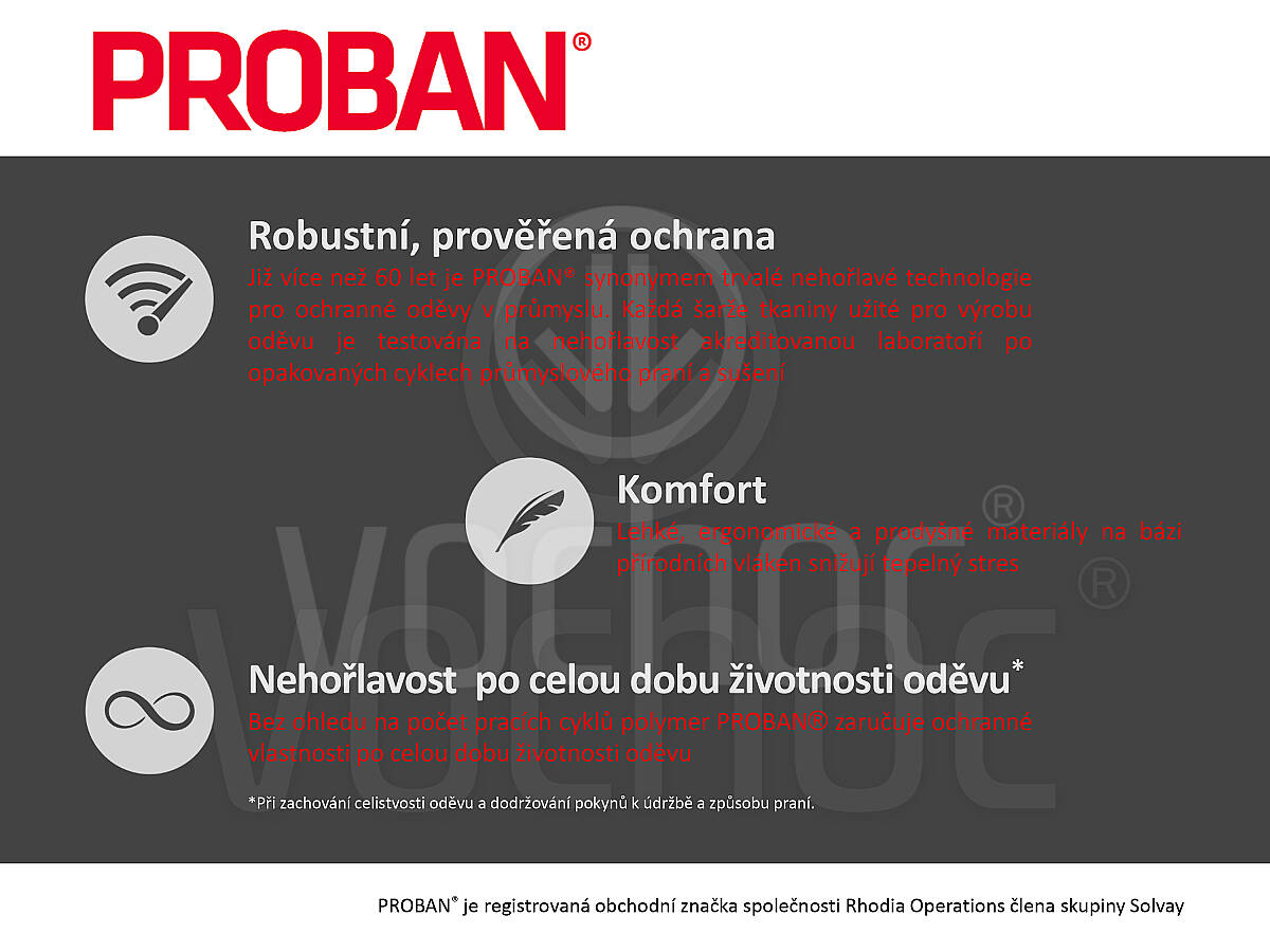 Materiál: 79% bavlna, 20% polyester, 1% antistat, gramáž 260 g/m2, trvalá nehořlavá úprava PROBAN®