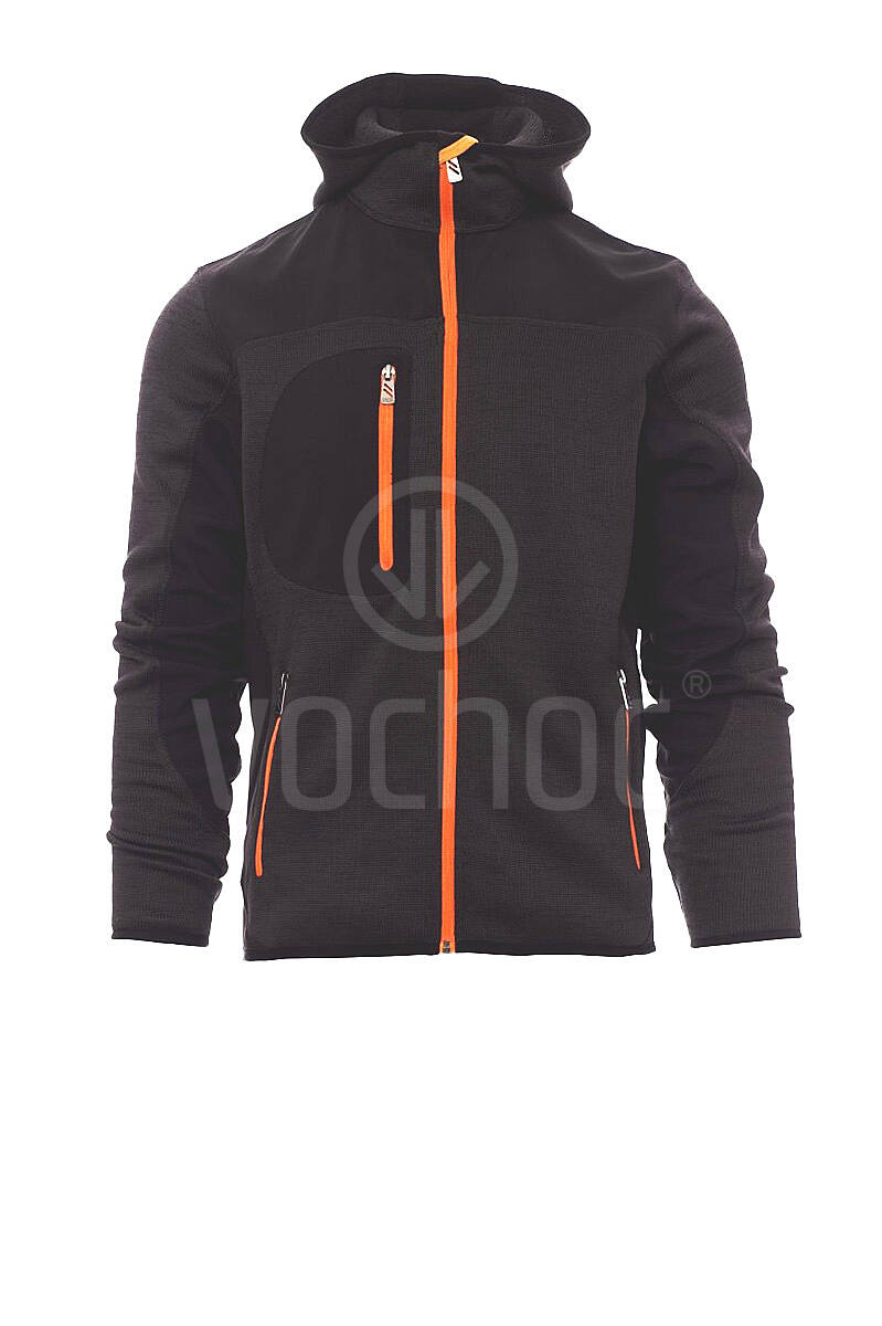 Pánská softshellová mikina, utěsněný celozip SBS, tvarovaná kapuce s dvojitým prošitím, tenký lem na zápěstí a v pase, dvě postranní kapsy na zip, jedna kapsa na hrudi. Úplet s vsadkami z černého softshellu.