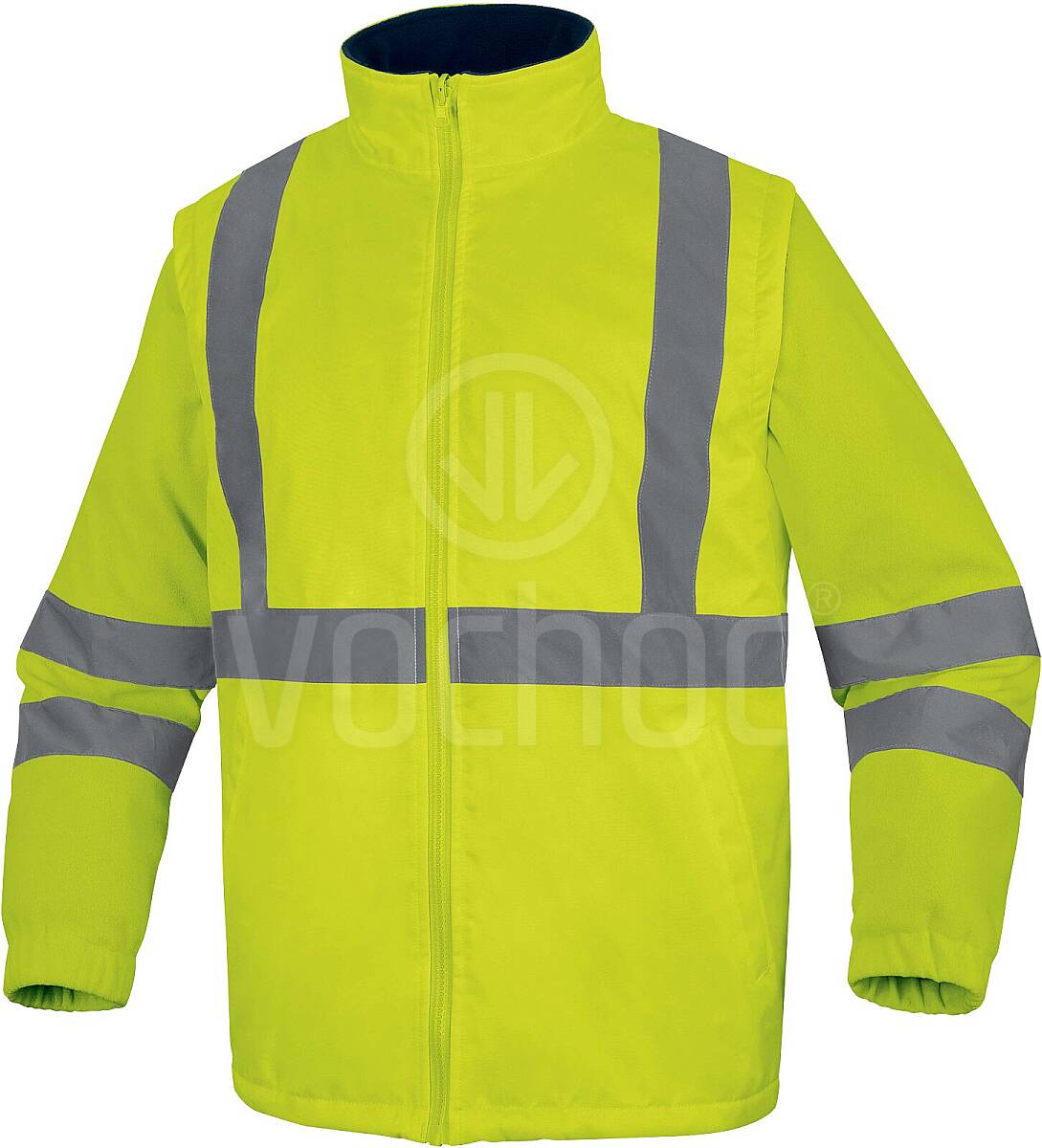 Bunda je vyrobena z plně vodotěsného a větruodolného materiálu, který spolehlivě ochrání před deštěm, chladem i větrem. Součástí je vyšší límec pro lepší ochranu krku a odnímatelné rukávy, díky nimž lze bundu snadno přeměnit na praktickou vestu. Termoizolační vrstva zajišťuje tepelný komfort i při nízkých teplotách. Vysokou viditelnost zaručují výrazné barvy a retroreflexní pásky, které splňují požadavky na bezpečnost při práci. Materiál je zároveň šetrný k pokožce a splňuje standard Oeko-Tex.