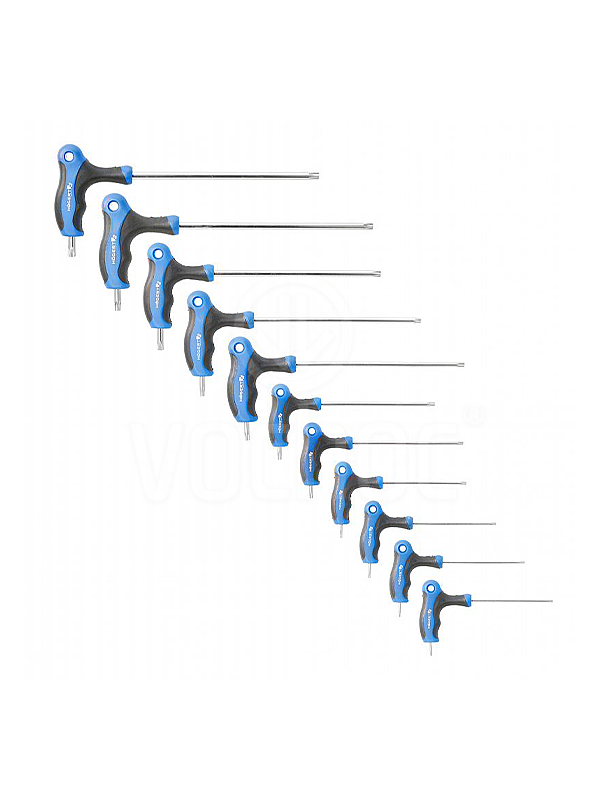 10 dílná sada přesných, dlouhých klíčů torx security vyrobených z legované oceli S2 nejvyšší kvality, která zaručuje maximální pevnost a odolnost proti deformacím a zkroucení. Použití držáku ve tvaru písmene „T“ zajišťuje pohodlí během používání a také pevné uchopení. Skvěle se osvědčí při povolování a dotahování šroubů ve stísněných prostorech. Klíče jsou nepostradatelné při práci v dílně, na stavbě, při opravách nebo v každé domácnosti. Sada obsahuje klíče o velikostech T8, T9, T10, T15,T20, T25, T27, T30, T40 a T45.