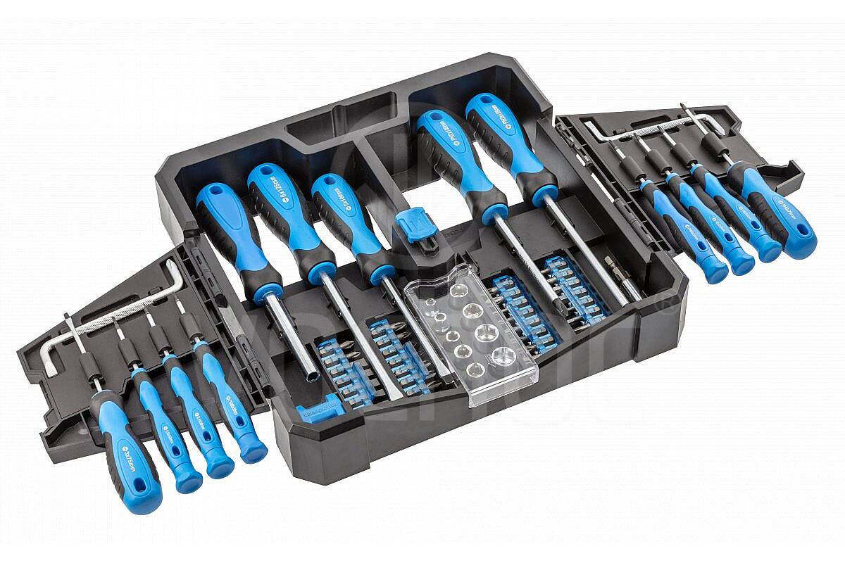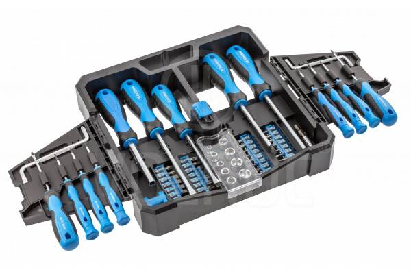 Sada šroubováků, šroubovacích bitů a nástrčných klíčů s příslušenstvím. Baleno v praktickém kufříku. Vyrobeno z vysoce kvalitní legované oceli S2. Magnetické hroty zvyšující přesnost a pohodlí práce. Dvoukomponentní rukojeť s protiskluzovým povrchem zvyšující utahovací sílu. Odoné proti deformaci a poškození.