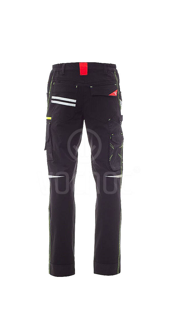 Pánské (unisexové) kalhoty "4 way stretch". Na přední straně kalhoty mají 2 zakulacené kapsy, na pravé straně kapsičku na mince a na levé straně bezpečnostní kapsičku na zip. Na přední straně levé nohavice jsou tři kapsy - vodorovná kapsa ze zapínáním na zip, kapsa s tvarovanou klopou na suchý zip a pouzdrem na jmenovku, malá svislá kapsa se zapínáním na zip. Na přední straně pravé nohavice je reflexní páska. Obě nohavice mají připevnění pro chrániče kolen s rozepínáním shora, reflexní vložky ve výšce kolen, patní chrániče z kontrastní látky. Boční prošívání a kontrastní výztuže na různých místech.