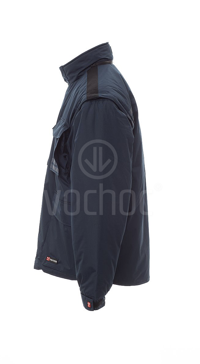 Pánská bunda s odepínacími rukávy. Plastový 5mm zip s kovovým jezdcem zakrytým klopu s plastovými knoflíky, kapuce balitelná do límce, stahovací manžety, reflexní pruhy, sladěné barvy na přední a zadní straně, boční rozparky s klínkem a zipem. Pět vnějších kapes, jedna s oboustranným pouzdrem na jmenovku. Zateplený vnitřek, mikrofleecový límec, záda a spodní část, prodyšné vsadky v podpaží, stahovací šňůrka v pase a zip na vnitřní straně pro snadnější potisk a vyšívání.