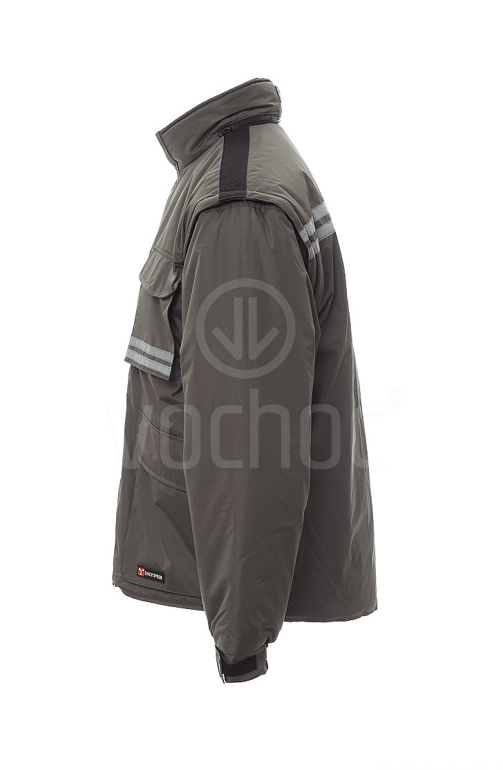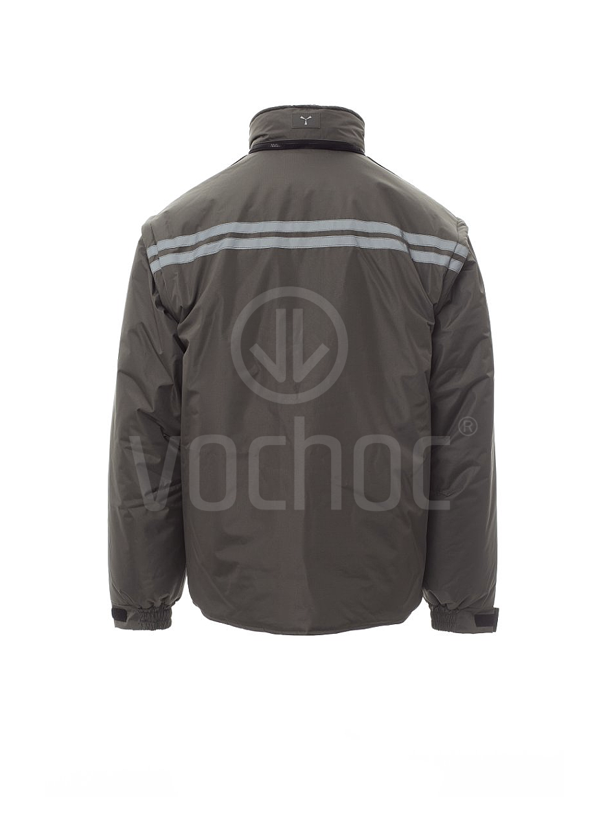 Pánská bunda s odepínacími rukávy. Plastový 5mm zip s kovovým jezdcem zakrytým klopu s plastovými knoflíky, kapuce balitelná do límce, stahovací manžety, reflexní pruhy, sladěné barvy na přední a zadní straně, boční rozparky s klínkem a zipem. Pět vnějších kapes, jedna s oboustranným pouzdrem na jmenovku. Zateplený vnitřek, mikrofleecový límec, záda a spodní část, prodyšné vsadky v podpaží, stahovací šňůrka v pase a zip na vnitřní straně pro snadnější potisk a vyšívání.